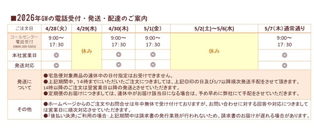 ◆土曜、日曜、祝日の発送業務は原則としてお休みです。