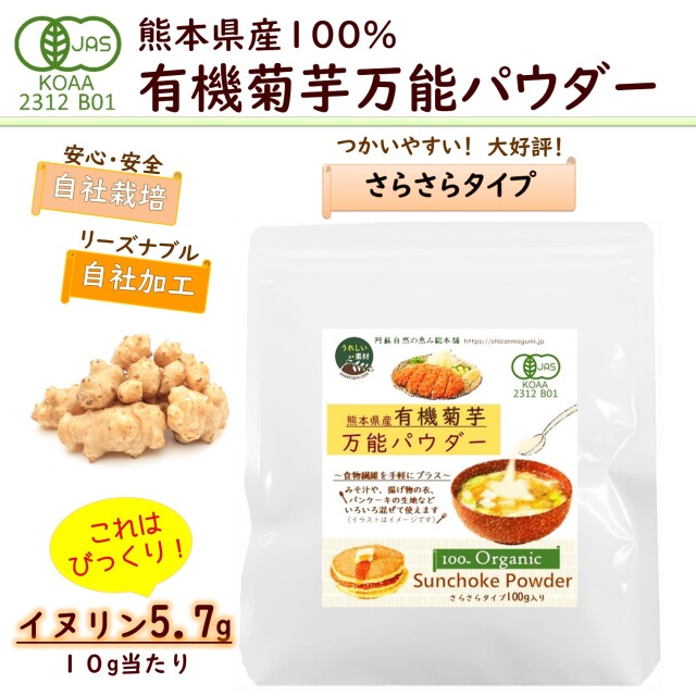 熊本県産の菊芋を乾燥したチップをパウダーにしました。下ごしらえもあく抜きもいりません●内容量100g×3 ●賞味期限3か月前までのものをお届けいたします。